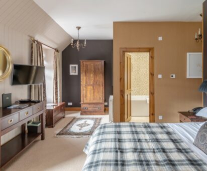 Aspen is a medium sized room with a king size bed that can be turned into 2 single beds and an extra sofa bed. The en-suite bathroom has a shower over the bath. Views are to front of Lodge over the grounds and surrounding mountains.