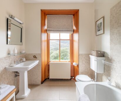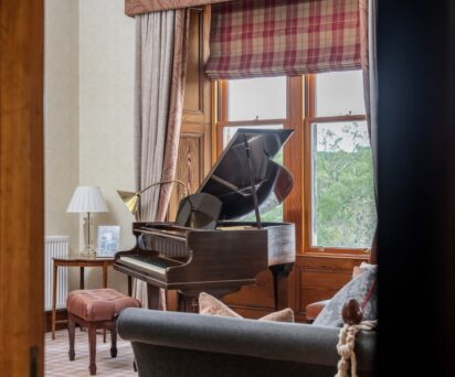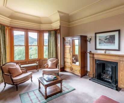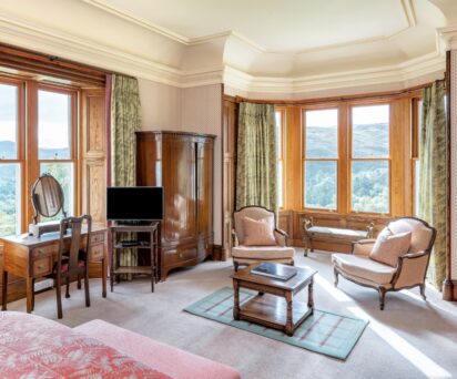 Rowan is a large room with a king size bed which can be twinned if necessary. The large en-suite bathroom has a separate bath and shower and two hand basins. The room also has a separate sitting room with large sofa bed which could be used for a child. Private dining can be set up in the room upon request. Views are to front of Lodge over the grounds and surrounding mountains.