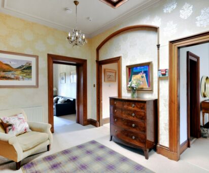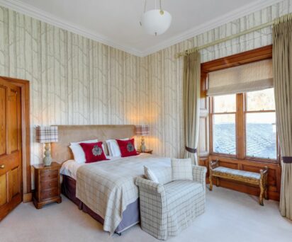 The lodge is comfortable and spacious, sleeping up to 14 guests in 7 rooms. Its traditional design includes original fireplaces and tall sash windows, which makes it feel like a true Scottish home away from home.