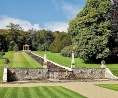 At Ballyfin, stone walls enclose 600 acres of parkland, a lake and ancient woods, delightful garden buildings, follies and grottoes. The landscape, laid out in the mid-eighteenth century, is among the finest examples in Ireland of the natural style of gardening inspired by ‘Capability’ Brown. Among other highlights are the medieval-style tower, built as a folly in the 1860s, and the walled gardens.
