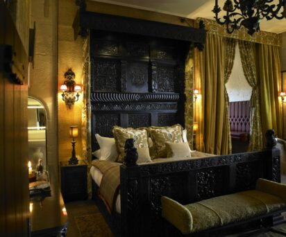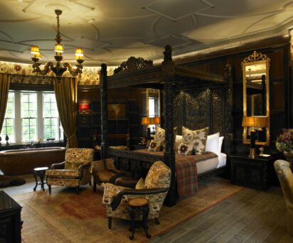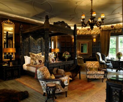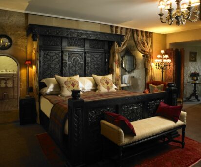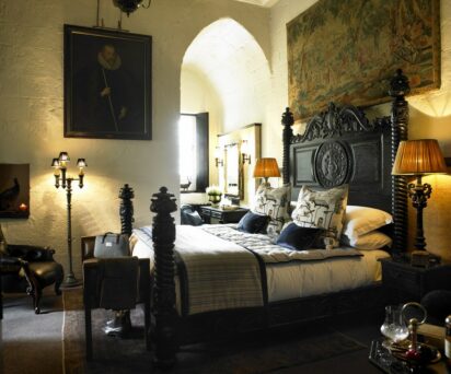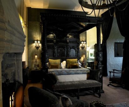 Within the castle there are ten uniquely designed bedchambers with lavish bathrooms, plus the newly refurbished Gatehouse sleeping 2 guests and Crookston Cottage which can sleep a further 4 guests, bringing the total capacity to 26 guests.