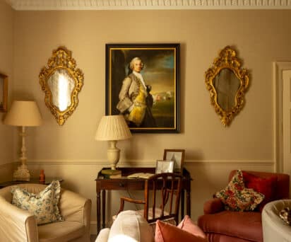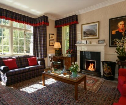 The large drawing room is furnished with beautiful antique furniture, deep sofas and a roaring fire. The library is clad in family tartan, and is an inspirational place to sit and read. The dining room is wonderful for entertaining, and the large kitchen is very well equipped with a separate large utility room beyond it, housing the laundry facilities.