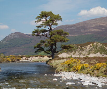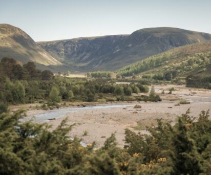 Coire Domhain enjoys glorious views up Glenfeshie and overlooks ancient pines, hills, heather and the River Feshie.