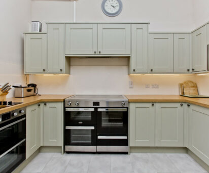 There is a well-equipped, newly refurbished kitchen with two dishwashers, a glasswasher, two electric cookers, microwave, coffee maker and larder.