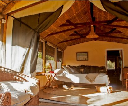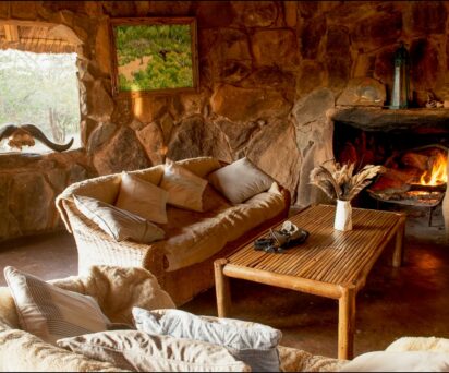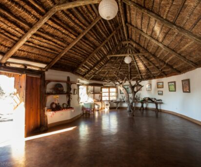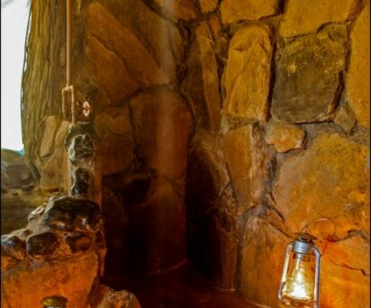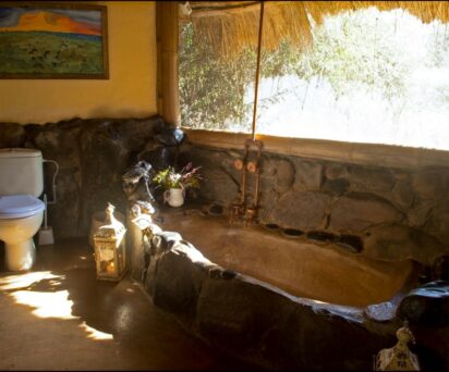 Each cottage is unique and all are ensuite, except one, with large baths made from black river stone and woodwork crafted by the lodge carpenter using fallen wood. Each cottage has been lovingly created with soft furnishings made locally and personal touches include handpicked flowers upon arrival. The cottages have electricity (solar) for lighting and hot water, flushing WC’s and bath/showers.