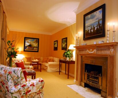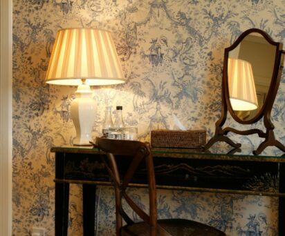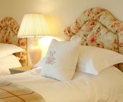 The sixth bedroom overlooks the gardens and the bay towards the gate houses for Gosford House. Decorated in a stunning blue Nina Campbell toile, this room comes with bathroom containing spa bath and overhead shower.