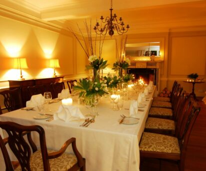 The panelled dining room enjoys views over the terrace and gardens. The dining table can seat 12 comfortably, or guests could set up the room for 30 guests for a special occasion or business event.