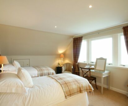 Bedroom two, a restful room decorated in the French style, has views over the sea to Fife. This room has both a free-standing shower and bath.