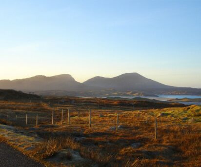 The south-west coast of lewis offers some of the most dramatic hill and sea-scape views in the Hebrides. While not high by mainland standards the hills rise sharply and directly from the sea. The ground is unyielding and flecked with exposed granite and interlinking pockets of water. The hill changes colour from vivid lush green in May to purple in August and to oranges and browns by late September. And the ever-changing weather plays tricks with the light regularly casting spotlights on raised peaks at the same time as plunging the foreground into semi-darkness.