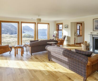 Hamanavay House is a spacious modern retreat for up to eight guests, set in a stunning position with commanding views of Loch Tamnabhaigh. Built in 1991 in a traditional style and newly refurbished to a high standard in 2021, the house has a large drawing room with seven floor-to-ceiling windows that let you watch the ever-changing view while you relax. The House faces west over Hamanavay sea-loch, a two mile long natural harbour.