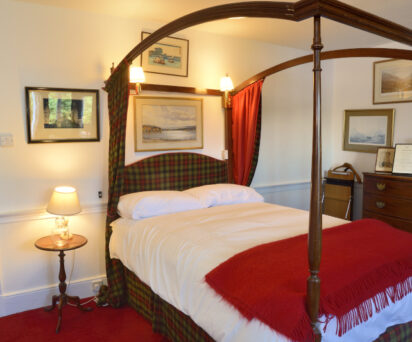 “Scots Double” 4 poster bed with family tartan canopy. (‘Scots Double’ is a small double/large single). Dedicated shower room in corridor.