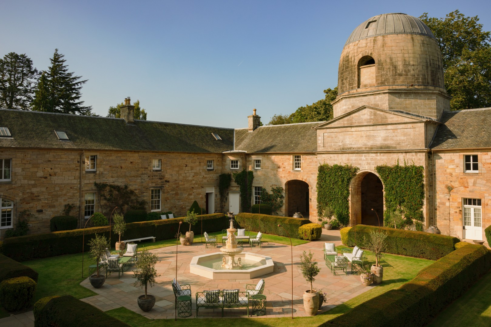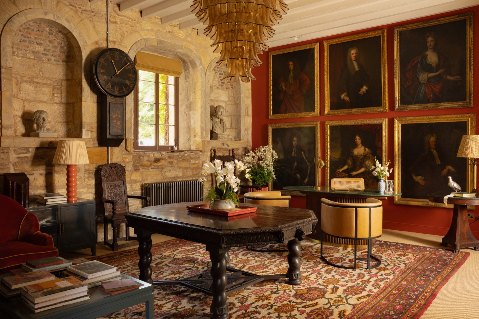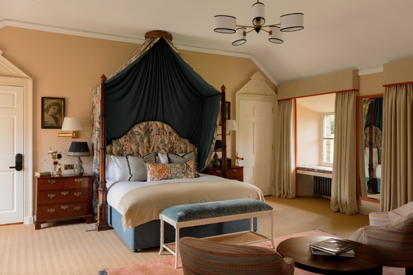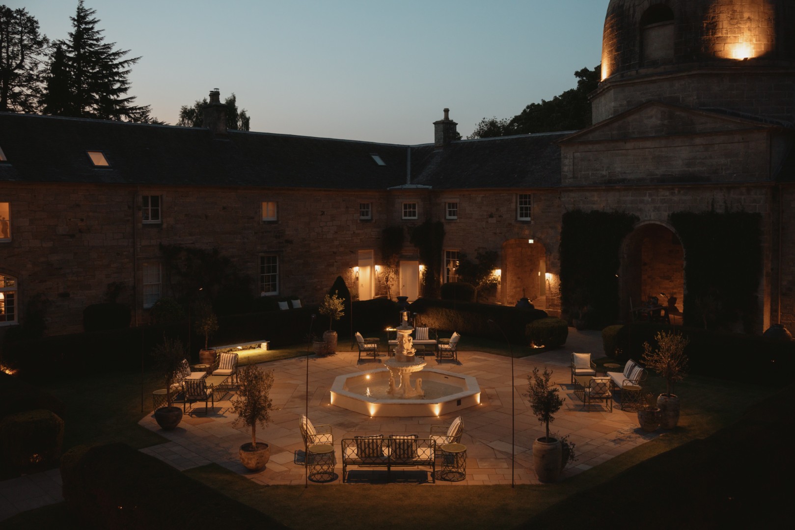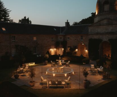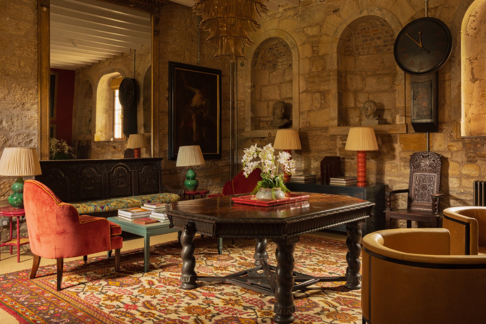 The eclectic vibe continues outside in the Italian courtyard, a tranquil sun trap where soft evening light and the gentle sound of the fountain create a sense of calm, while the adjacent Rose Garden provides a stunning croquet lawn and drinks terrace.