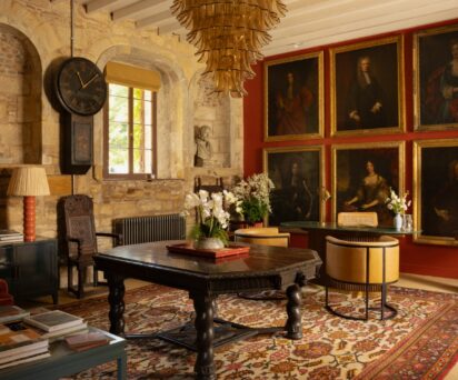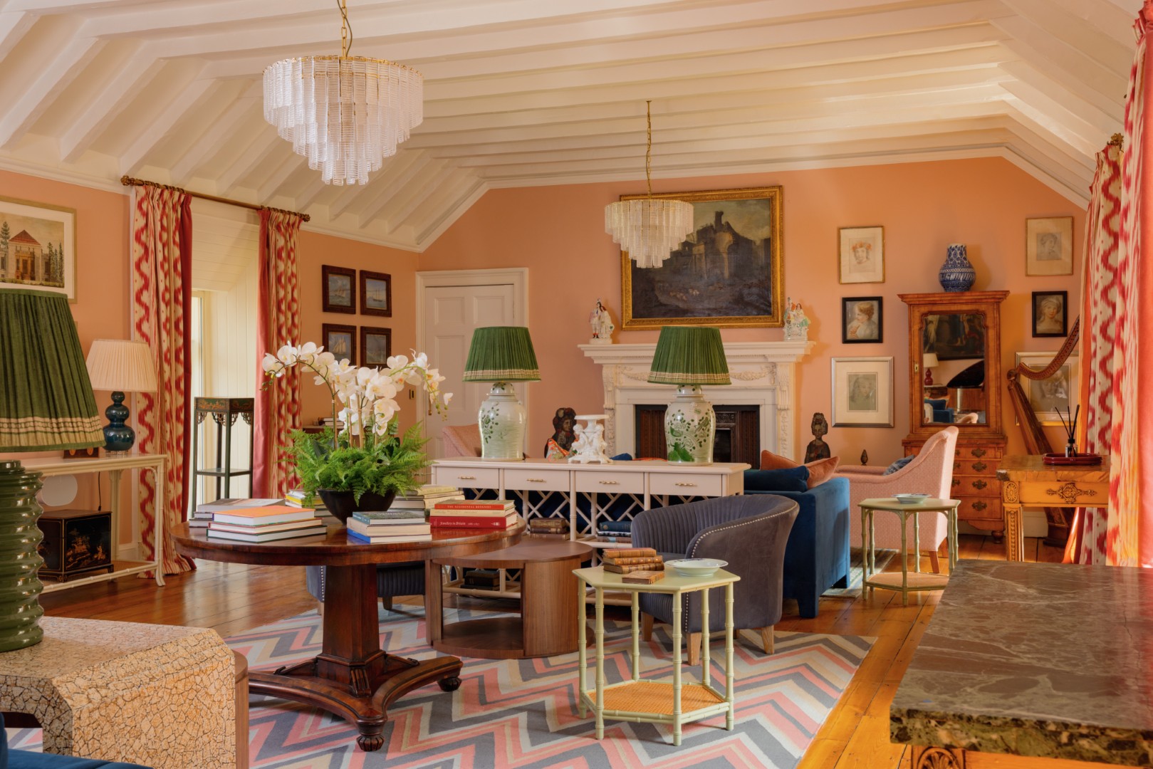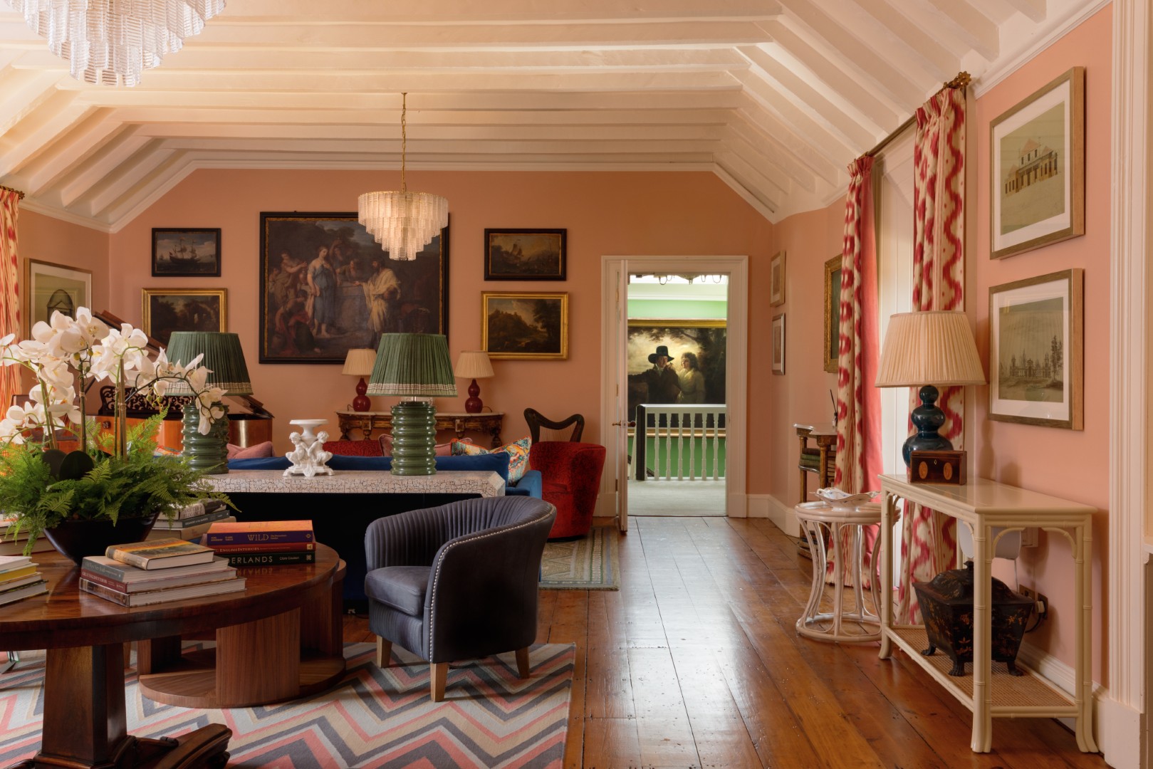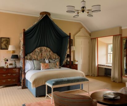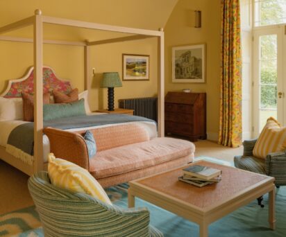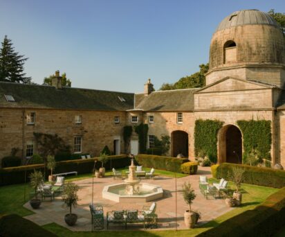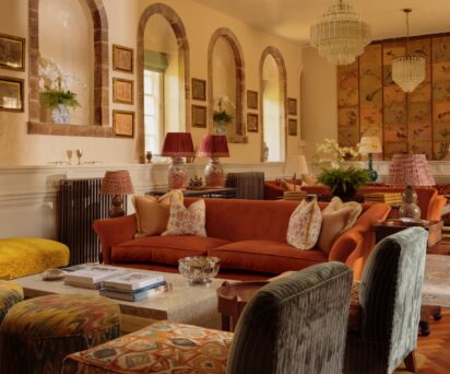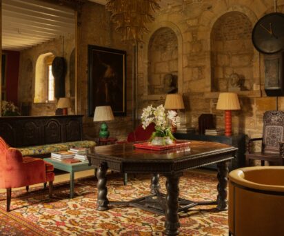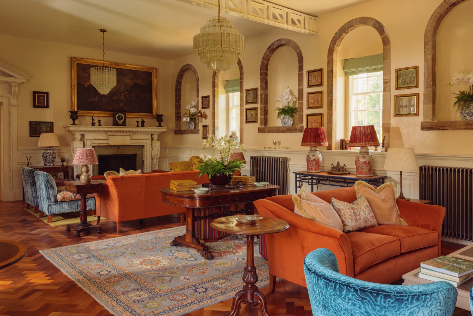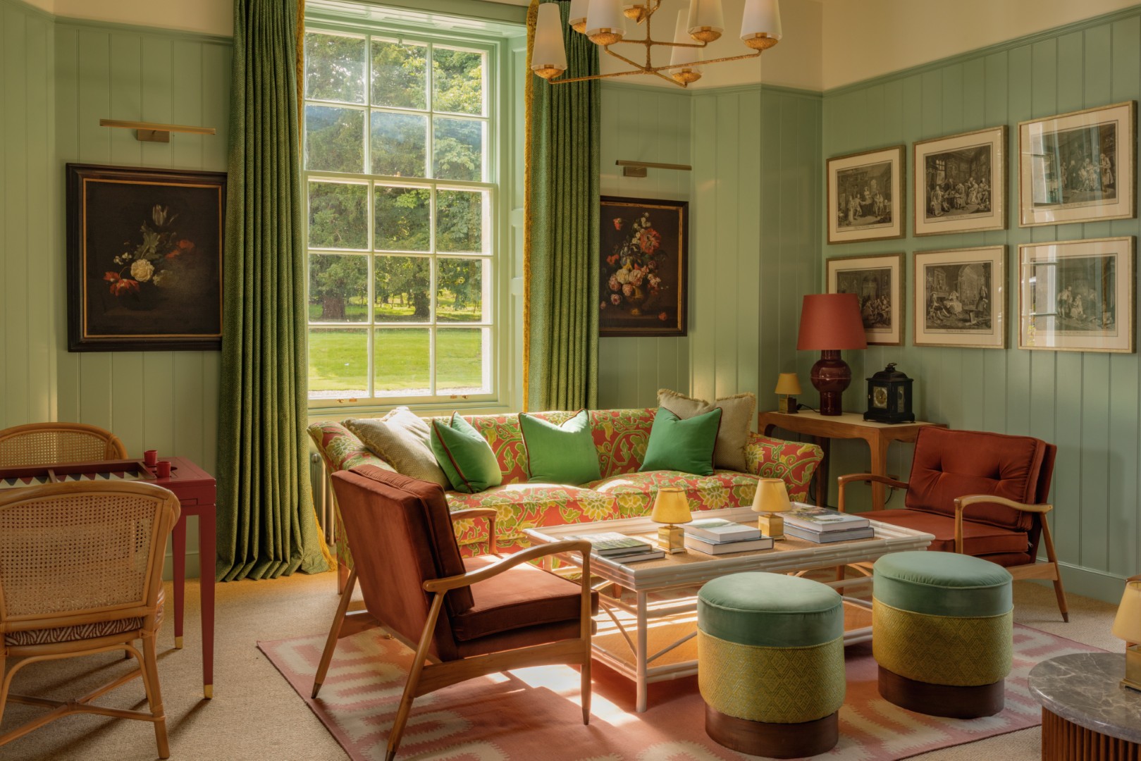 The eclectic vibe continues outside in the Italian courtyard, a tranquil sun trap where soft evening light and the gentle sound of the fountain create a sense of calm, while the adjacent Rose Garden provides a stunning croquet lawn and drinks terrace.