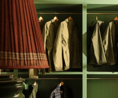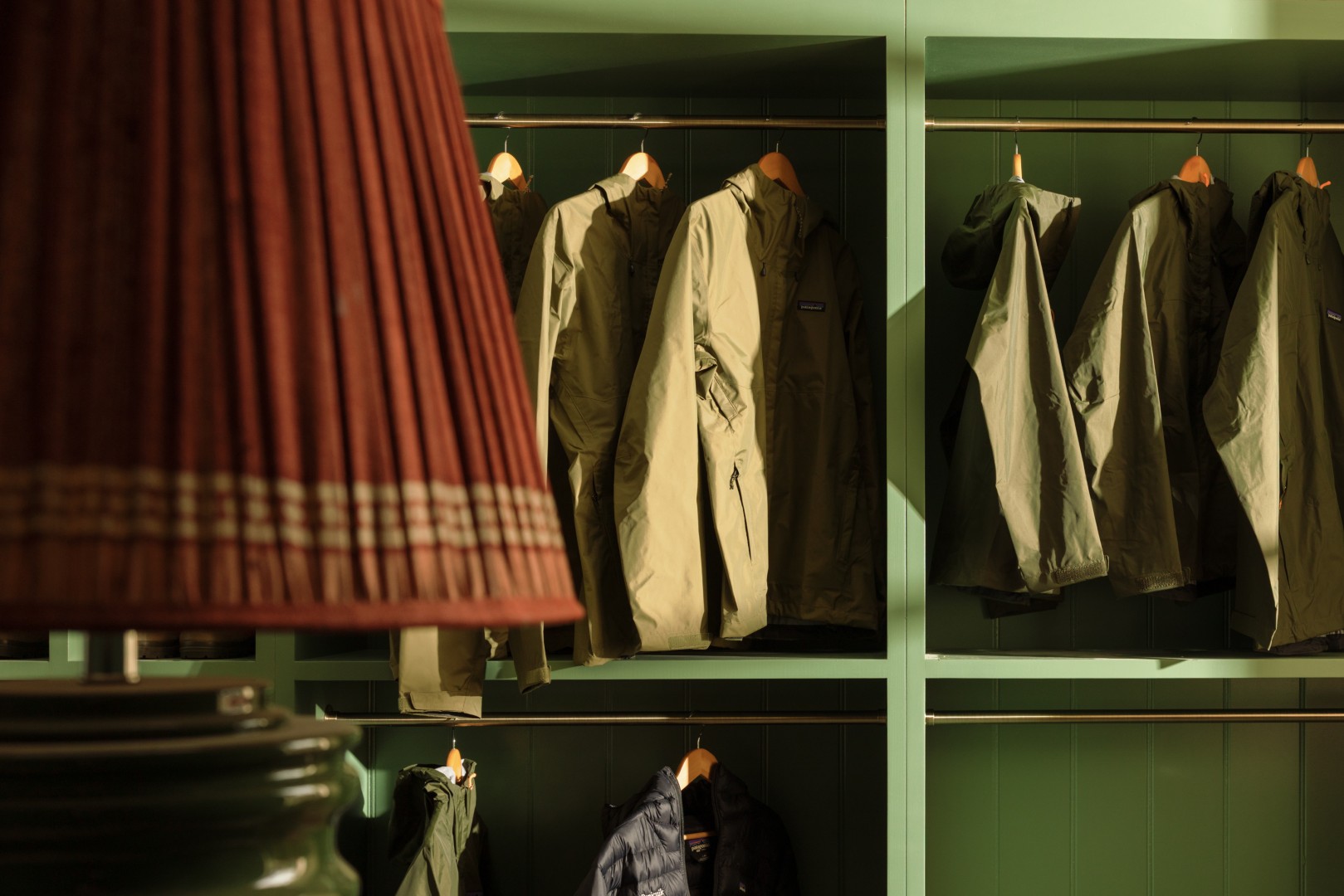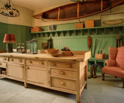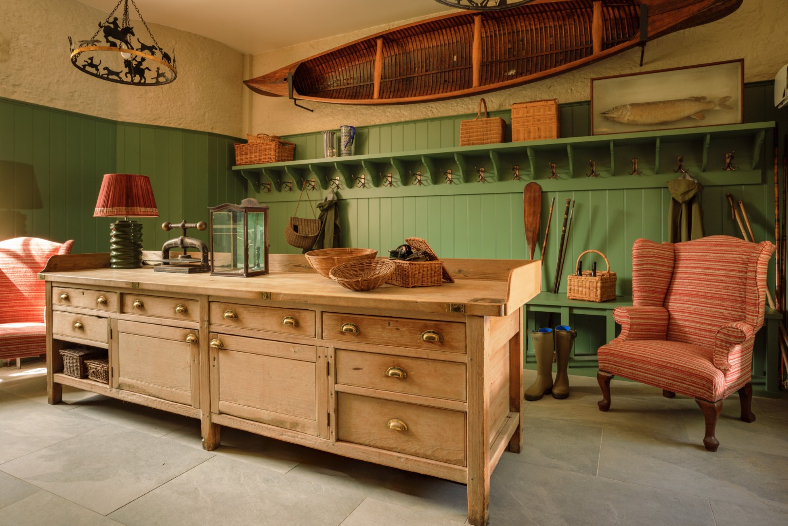 Boot room with wellington boots and outdoor gear for guests to borrow.