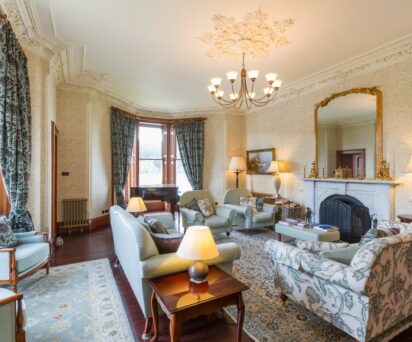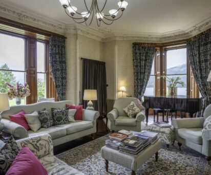 Drawing room with open fire, grand piano and access to the patio and views over Loch Tummel.