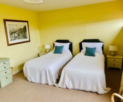 There is one double room with en-suite and one twin room with with bathroom opposite facing the sea. There is a small twin room, suitable for children in this part of the house. Looking up towards the hills there are one twin with en-suite, one double room with bathroom opposite, a further twin and a single room. There is one large shower room.