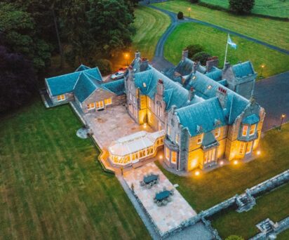Turin Castle Scotland stands in 20 acres of private grounds with terraced lawns overlooking the Angus glens. It has its own helicopter landing area and private gardens for outdoor activities.