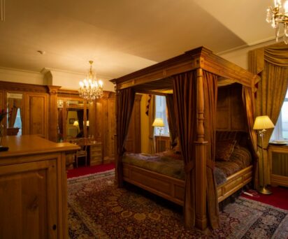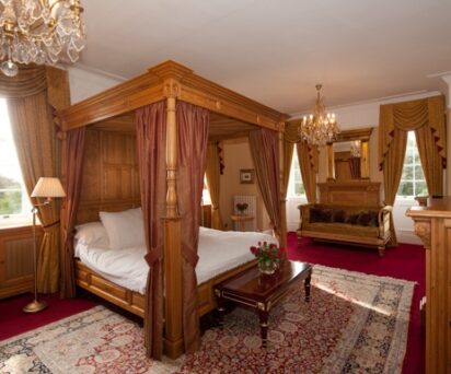 The Balvenie Suite features a king-size, four-poster bed and a dedicated en-suite. The bedroom overlooks the ancient stone circle and the gardens. The en-suite bathroom consists of a large shower, sink and toilet.