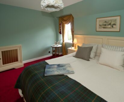 The Glenmorangie Suite is situated at the corner of the property and benefits from views over the gardens and the glassed-roof tartan courtyard. The bedroom features a king-size bed, en-suite bathroom and separate toilet room. The en-suite bathroom has a large shower and sink.